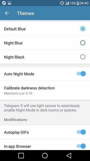 یک ویژگی جذاب دیگر تلگرام ایکس Telegram X، آپشن حالت شب خودکار است. با فعال کردن این گزینه، گوشی شما به محض وارد شدن به یک محیط تاریک، تم تلگرام را به حالت شب تغییر میدهد.