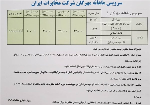 محمد جواد آذری جهرمی در صفحه اینستاگرام خود نوشت: (شرکت) مخابرات ایران روز گذشته طی نامه ای اعلام کرد که بنا دارد تعرفه های فوق را در مهرماه و برای برخی از استانها به صورت آزمایشی به اجرا درآورد. انتخاب این مدل برای مشترکین اختیاری است و مشترکین می توانند در صورت تمایل از مدل های قبلی بهره گیری کنند. این اقدام مخابرات در راستای بررسی آمادگی شبکه برای ارائه سرویس های غیرحجمی است.
