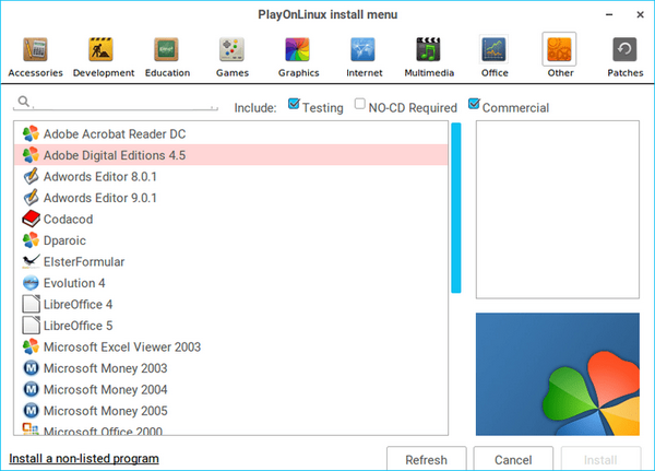 وقتی شما برای اولین بار Play On Linux را اجرا میکنید یک نوار ابزار در بالای صفحه به همراه گزینههایی برای اجرا، بستن، نصب، حذف یا پیکربندی اپلیکیشنها در اختیار شما قرار خواهد گرفت. یک گزینه برای نصب یک برنامه نیز در سمت چپ صفحه قرار دارد. وقتی شما گزینه نصب را انتخاب میکنید فهرستی از دسته بندیهای مختلف تحت عناوین زیر ظاهر خواهد شد: