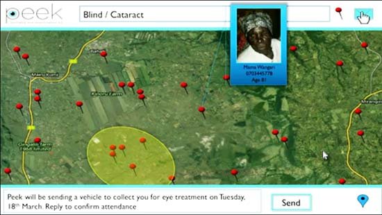 امروز ما به جای آنکه منتظر بمانیم تا هرگز بیماران به سراغ ما نیایند، ما به سراغ آنها میرویم. ما به خانههای آنها میرویم و کاملترین، بهروزترین و دقیقترین معاینهای را که توسط هر کس با کمترین میزان آموزش قابل انجام است، ارائه میدهیم. ما میتوانیم متخصصان در سراسر جهان را به مردمی در مکانهایی دورافتاده و غیر قابل دسترس متصل کرده و این امکان را فراهم آوریم تا ایشان را معاینه کرده و برنامه درمانی برای ایشان ارائه کنند. مدیران پروژه و مدیران بیمارستانها میتوانند از هرجنبه که مایل هستند از طریق واسط جستوجوی ایجاد شده از طرف ما به بررسیهای مورد نظر خود بپردازند. اینجا در ناکورو، که من در آن زندگی میکنم، ما میتوانیم بهدنبال مردم با هر پارامتری بگردیم. اینجا مردمی را نشان میدهد که بهدلیل یک نوع قابل درمان آب مروارید نابینا شدهاند. هر نقطه قرمز نمایانگر کسی است که به دلیل یک بیماری قابل درمان نابینا شده است و اینها قابل مکانیابی هستند. ما میتوانیم با استفاده از سرویسهای ارسال انبوه پیام متنی اطلاع دهیم که در حال مراجعه برای درمانشان هستیم (شکل3)