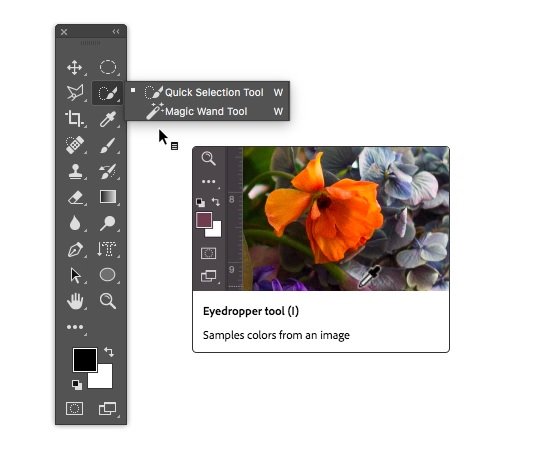 پالت ابزارهای فوتوشاپ در سمت چپ باریک و طولانی است. اما ابزارهای پنهان بسیاری در آن قرار دارد که با کلیک کردن روی فلش کوچک نشان داده میشوند. در این پالت 65 ابزار برای انتخاب، برش، روتوش، نقاشی، رسم و.... وجود دارد. پیشنهاد ما این است که فرآیند یادگیری را با ابزاری آغاز کنید که پیشزمینه اولیه در ارتباط با آن دارید. همچنین در هر روز تنها کار کردن با یک ابزار را آزمایش کنید. برای دریافت اطلاعات بیشتر در ارتباط با ابزارها و دسترسی به منابع قدرتمند از عبارتهایی همچون "آموزش ابزارهای جادویی فوتوشاپ" به فارسی یا "tutorial magic wand tool Photoshop " به انگلیسی استفاده کنید. Rich Tooltips در فوتوشاپ هم نقطه شروع خوبی است. اگر در هر روز تنها کار کردن با یک ابزار را یاد بگیرید با مشکل افزونگی اطلاعات روبرو نخواهید شد. همچنین به راحتی میتوانید میانبرهای صفحهکلید مرتبط با ابزارها را به خاطر بسپارید.