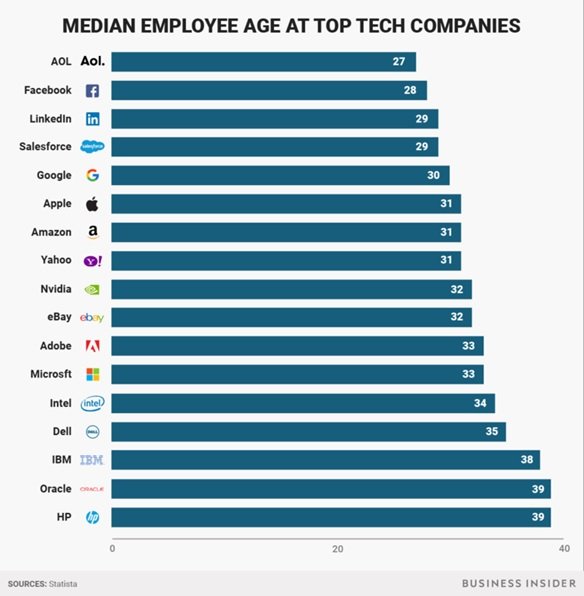 در سالهای اخیر، شرکتهای برتر عرضه فناوری به ندرت افرادی که مسن بودهاند را استخدام کردهاند. این شرکتها تا حد امکان از تمدید قرارداد افرادی که مسنتر هستند اجتناب میکنند. در این میان دو استثناء نیز وجود دارد. اچپی و آمازون جزء آن گروه از شرکتهایی هستند که زمانی که صحبت از استخدام به میان میآید به دنبال جذب افرادی هستند که مسنتر بوده و تجربه کافی دارد. در تصویر زیر میانگین سن افرادی که در شرکتهای برتر عرضه فناوری در ایالات متحده مشغول به کار هستند را مشاهده میکنید.