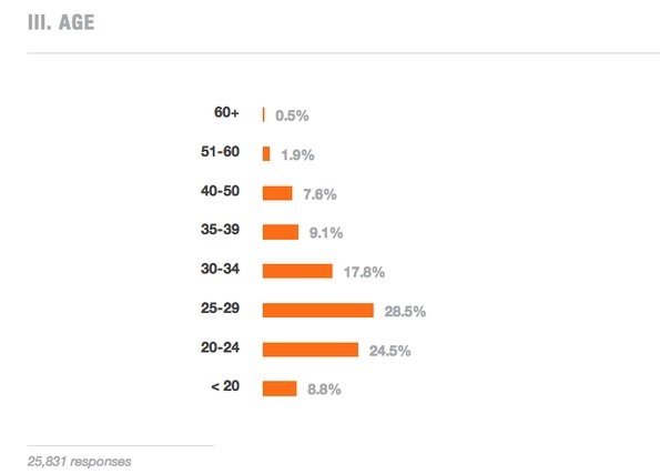 سایت استکاورفلو که از شناخته شدهترین سایتها نزد طراحان و توسعهدهندگان است، نتیجه نظرسنجی جالبی که در همین ارتباط انجام شده را منتشر کرده است. در نظرسنجی این سایت بیش از 36 هزار نفر از 127 کشور جهان حضور داشتند. در نظرسنجی انجام شده از سوی استکاورفلو میانگین سن توسعهدهندگان، سطح تجربه، جنسیت و مواردی از این دست را شامل شده است. دادههای جمعآوری شده از سوی این سایت نشان میدهد که میانگین سنی توسعهدهندگان 28 سال است. این نظرسنجی نشان میدهد که تنها 4.8 درصد از توسعهدهندگانی که در این نظرسنجی شرکت داشتهاند در محدوده سنی 40 تا 50 سال قرار داشتند. همچنین تنها 9.1 درصد از توسعهدهندگان نیز در محدوده سنی 35 تا 39 سال قرار داشتند.