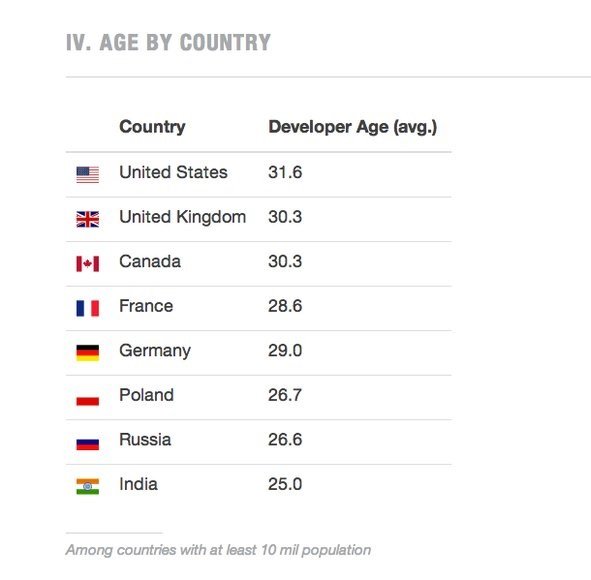 یکی دیگر از نکات جالب توجه این نظرسنجی در ارتباط با ایالات متحده است. تصویر زیر نشان میدهد که ایالات متحده بالاترین سن متوسط برای توسعهدهندگان با 31 سال را از آن خود کرده است.