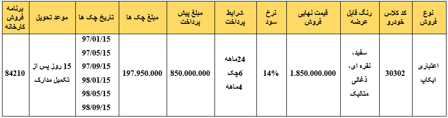 - تحویل خودرو در نمایندگی هاي منتخب ایکاپ می باشد.