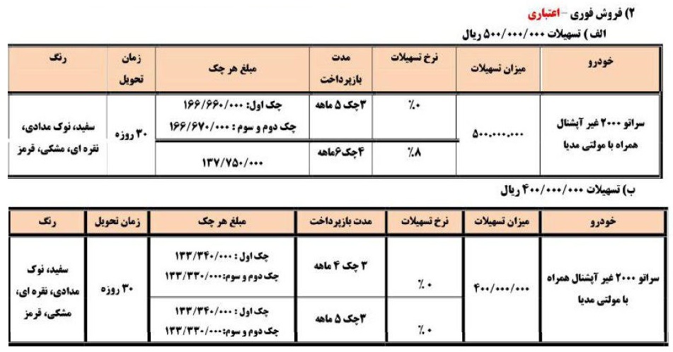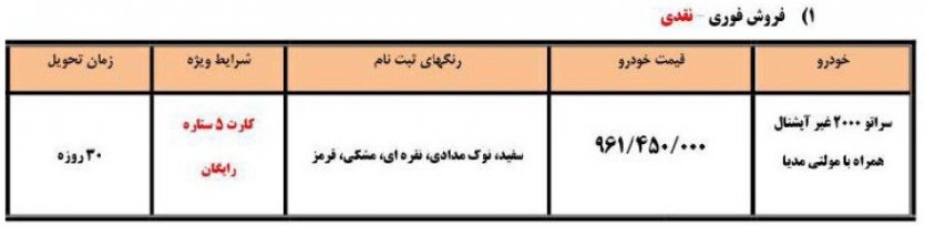 به اطلاع کلیه متقاضیان محترم محصولات شرکت سایپا میرساند، شرایط فروش نقد و اقساط خودروی کیا سراتو 2000 غیرآپشنال همراه با مولتی مدیا از تاریخ ابلاغ این بخشنامه (21 آبان 96) به مدت و تعداد محدود به شرح مفاد این بخشنامه ابلاغ میگردد: