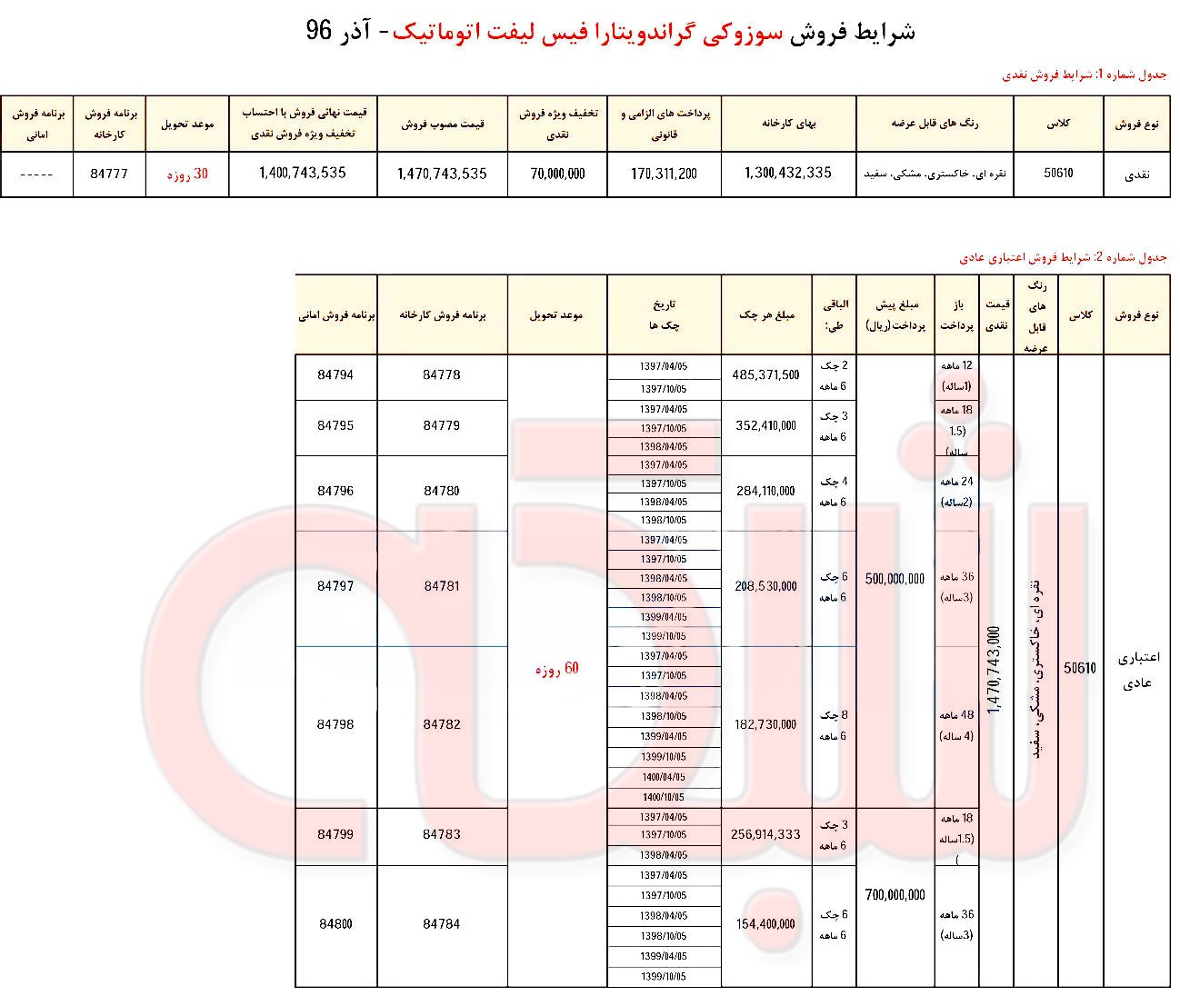 شرایط فروش نقد و اقساط خودروی سوزوکی گراندویتارا فیسلیفت اتوماتیک شرکت ایران خودرو از روز چهارشنبه 96/09/01 تا زمان تکمیل ظرفیت به شرح جداول پیوست و با شرایط ذیل ارائه می گردد:
