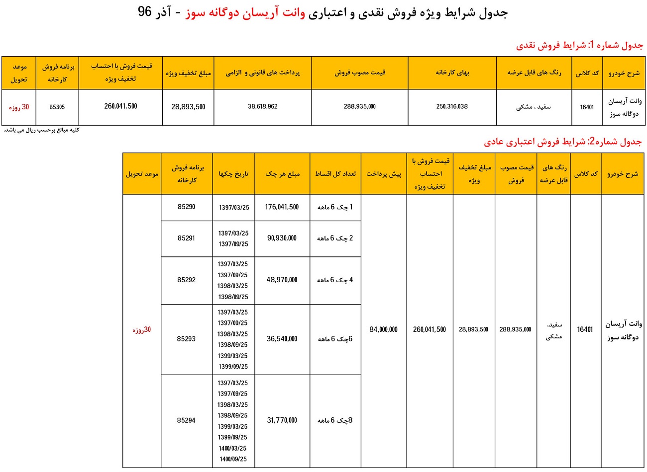 به اطلاع کلیه متقاضیان محترم محصولات شرکت ایران خودرو می رساند، شرایط ویژه فروش نقدی و اعتباری خودروي وانت آریسان دوگانه سوز از روز شنبه مورخ 96/09/11 تا زمان تکمیل ظرفیت به شرح جداول پیوست و با شرایط ذیل ارائه می گردد: