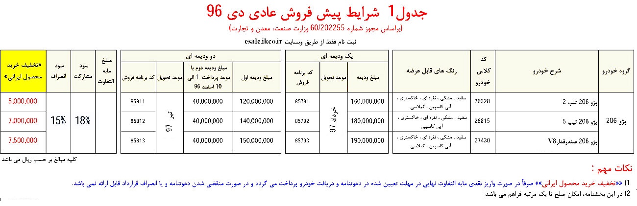 به اطلاع کلیه متقاضیان محترم محصولات ایران خودرو می رساند، شرایط پیش فروش دی ماه 96 محصولات پژو 206 به همراه "تخفیف خرید محصول ایرانی"، از روز شنبه 96/10/02 لغایت 96/10/30 و یا تا زمان تکمیل ظرفیت و به شرح جدول ارائه می گردد.