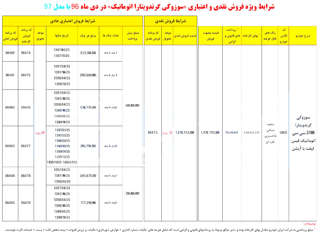 به اطلاع کلیه متقاضیان محترم محصولات ایران خودرو می رساند، شرایط فروش نقدی و اقساطی خودروهای SUV شرکت ایران خودرو با مدل 97 از روز یکشنبه 96/10/10 لغایت 96/10/30 و یا تا زمان تکمیل ظرفیت به شرح جدول پیوست و با شرایط ذیل ارائه می گردد: