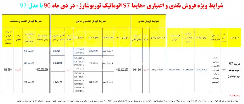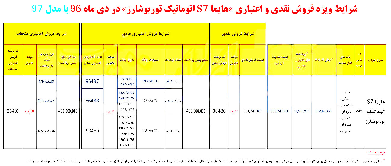 به اطلاع کلیه متقاضیان محترم محصولات ایران خودرو می رساند، شرایط فروش نقدی و اقساطی هایما S7 توربو مدل 97 از روز یکشنبه 96/10/10 لغایت 96/10/30 و یا تا زمان تکمیل ظرفیت به شرح جدول پیوست و با شرایط ذیل ارائه می گردد: