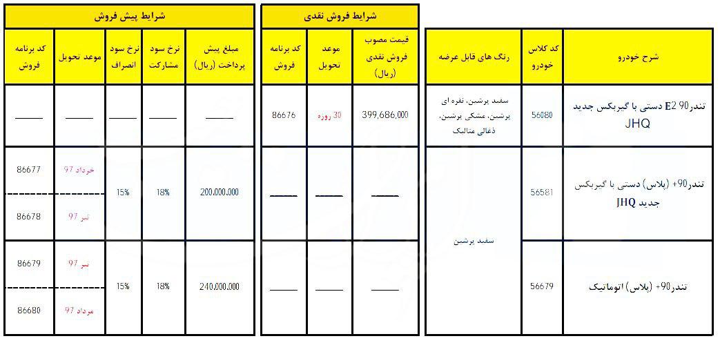 به اطلاع کلیه متقاضیان محترم محصولات ایران خودرو میرساند، شرایط ویژه فروش نقدی و پیشفروش محصولات تندر90 به شرح جدول پیوست و توضیحات زیر از روز چهارشنبه 96/10/20 لغایت 96/10/30 و یا تا زمان تکمیل ظرفیت ارائه می گردد.