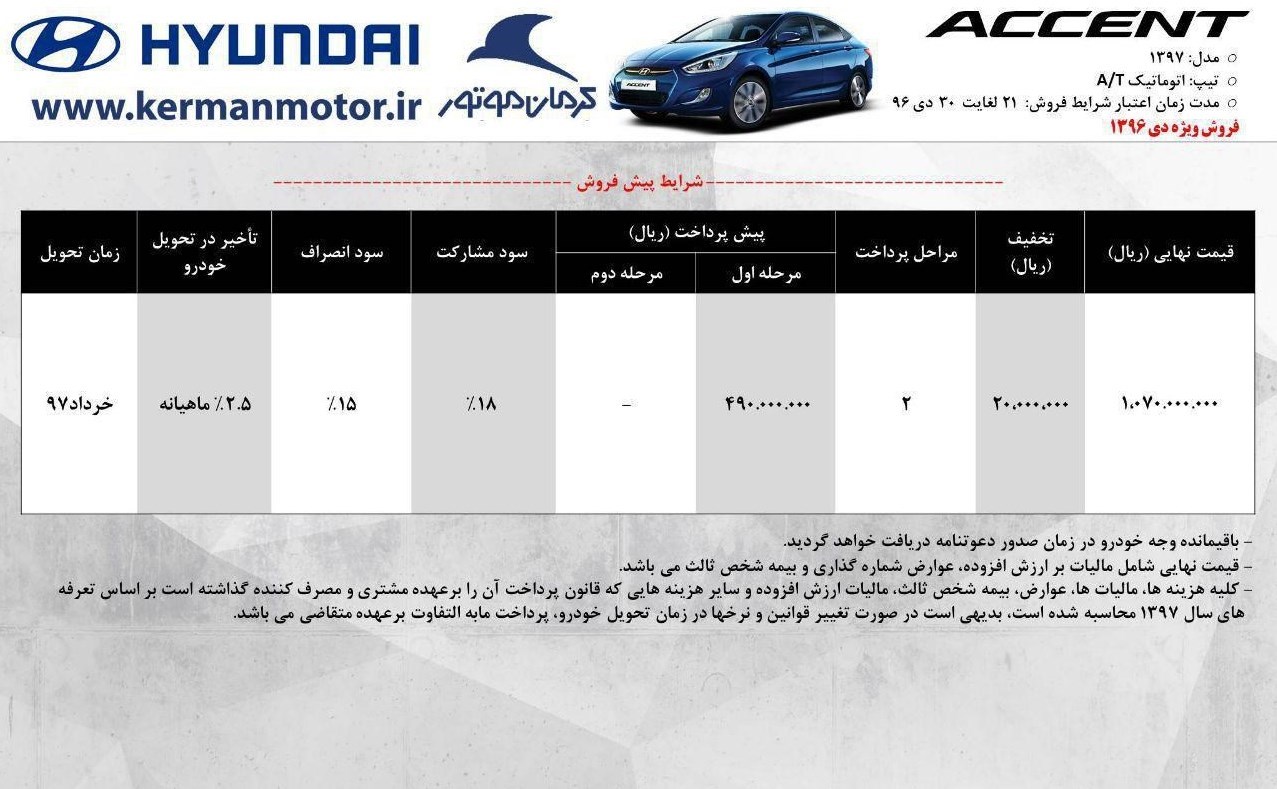 کرمان موتور اعلام کرد فروش هیوندای اکسنت با تخفیف 2 میلیون تومانی ویژه نیمه دوم دی ماه ادامه دارد.