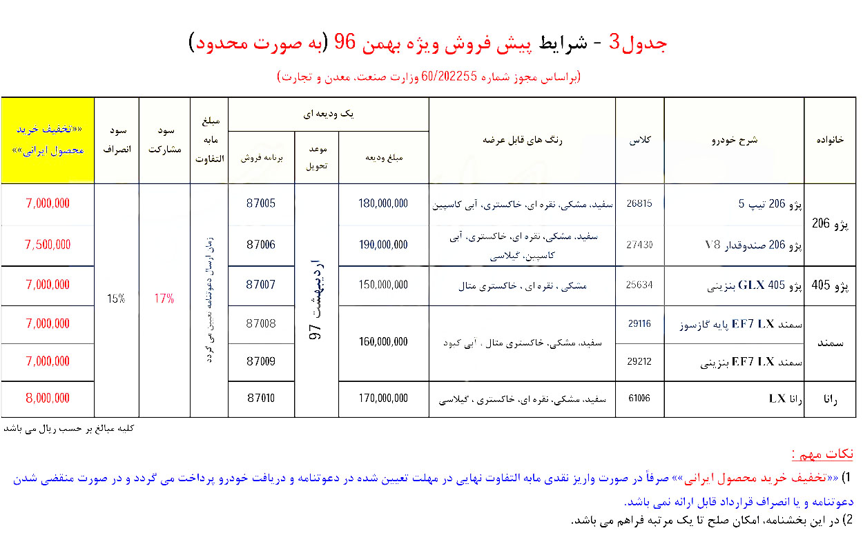 تخفیف خرید محصول ایرانی قابل ارائه در این بخشنامه، صرفاً در صورت واریز نقدي مابه التفاوت نهایی در مهلت تعیین شده در دعوتنامه و دریافت خودرو پرداخت می گردد و در صورت منقضی شدن دعوتنامه و یا انصراف قرارداد قابل ارائه نمی باشد.