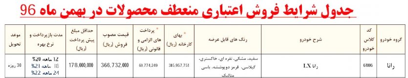 به اطلاع کلیه متقاضیان محترم محصولات شرکت ایران خودرو میرساند، شرایط فروش اقساطی منعطف بهمن ماه 96 خودروی رانا از روز یکشنبه 96/11/01 تا زمان تکمیل ظرفیت به شرح جدول پیوست ارائه می گردد.