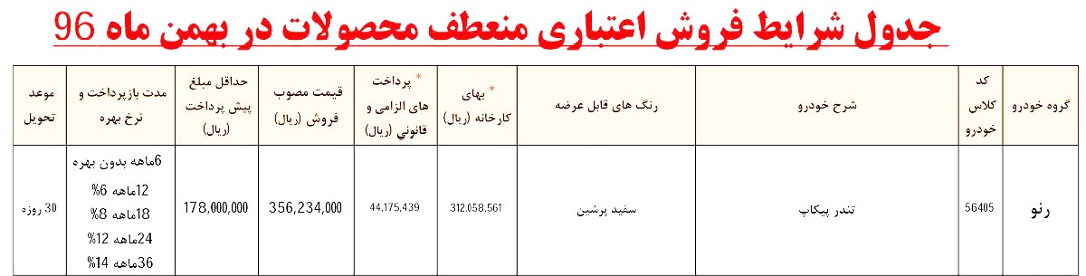 به اطلاع کلیه متقاضیان محترم محصولات شرکت ایران خودرو میرساند، شرایط فروش اقساطی منعطف بهمن ماه 96 تندر پیکاپ از روز یکشنبه 96/11/01 تا زمان تکمیل ظرفیت به شرح جدول پیوست ارائه می گردد.