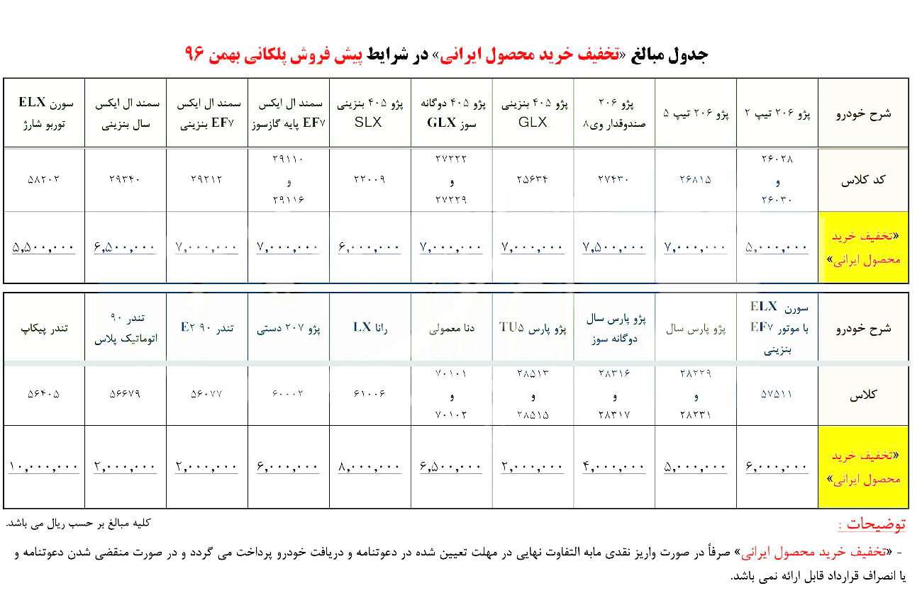 به اطلاع کلیه متقاضیان محترم محصولات شرکت ایرنخودرو میرساند، شرايط پیش فروش پلکانی بھمن 96 به ھمراه تخفیف خريد محصول ايرانی و "ھديه ويژه ھمكاری در تولید"، از روز يكشنبه 96/11/01 لغایت 96/11/30 و یا تا زمان تكمیل ظرفیت به شرح جدول پیوست ارائه میگردد.