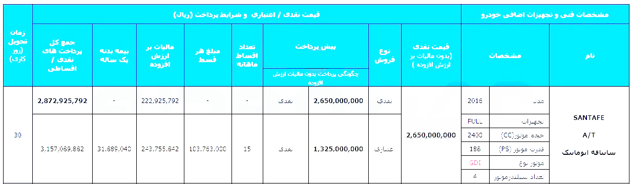 بر اساس شرایط اعلام شده از سوی آسان موتور، هیوندای سانتافه عرضه شده از سوی این شرکت در مدل 2016 و با قیمت نقدی 265 میلیون تومان عرضه میشود که با احتساب مالیات بر ارزش افزوده درنهایت قیمت این خودرو به 287میلیون تومان میرسد. آسان موتور همچنین هیوندای سانتافه را با شرایط اعتباری نیز عرضه میکند. بر این اساس خریداران میتوانند با پرداخت 132.5 میلیون تومان نسبت به خرید این خودرو اقدام کنند و باقی مانده مبلغ را طی 15 قسط پرداخت کنند.