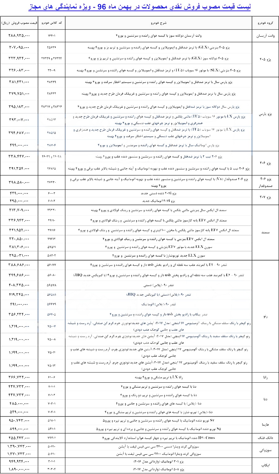 گروه صنعتی ایران خودرو لیست جدید قیمت محصولات خود را ویژه بهمنماه 96 منتشر کرد. بر پایه این گزارش، 3 محصول جدید به این لیست اضافه شده است که قیمت آن چند روز پیش از سوی این شرکت اعلام شده بود.