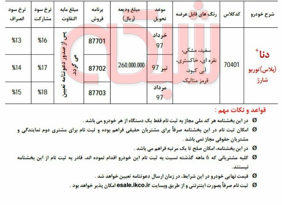 شرایط پیشفروش خودروی دناپلاس توربو شارژر به مناسبت دهه فجر با ظرفیت محدود از روز چهارشنبه مورخه 1396/11/18 تا تکمیل ظرفیت به شرح جدول زیر اعلام میشود.