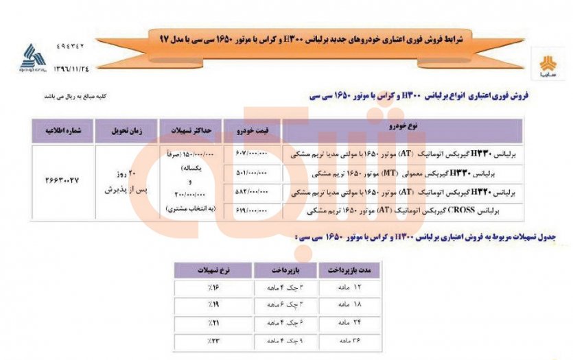 شرایط فروش فوری اعتباری خودروهای جدید برلیانس H300 و کراس با موتور 1650 سیسی اعلام شد.