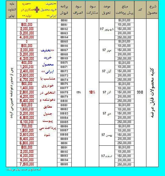 به ازاي ھر ثبت نام در این بخشنامه، مازاد بر سود مشاركت، تخفیف خرید محصول ایراني و ھدیه ھمكاری در تولید نیز پرداخت میگردد.