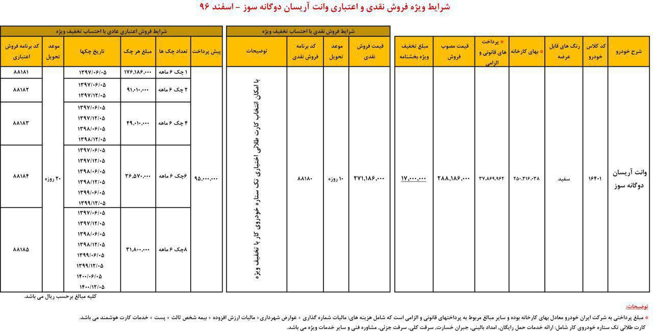 شرایط فروش نقدی و اعتباری وانت آریسان - اسفند 96