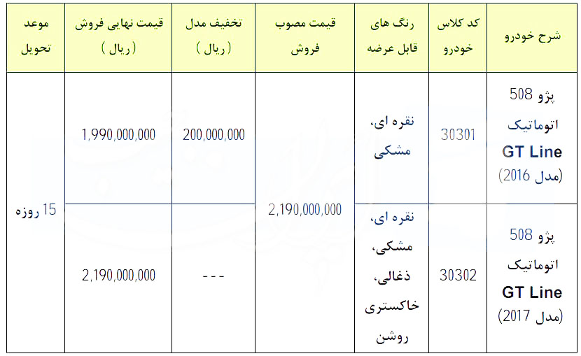 باتوجه به برنامه ریزيهاي صورت گرفته و سیاستهای فروش شرکت ایکاپ، شرایط فروش نقدی محصول پژو 508 اتوماتیک به صورت نقدی و به تعدادی محدود از روز دوشنبه مورخ 07/12/96 تا زمان تکمیل ظرفیت به شرح جدول پیوست ارائه میگردد: