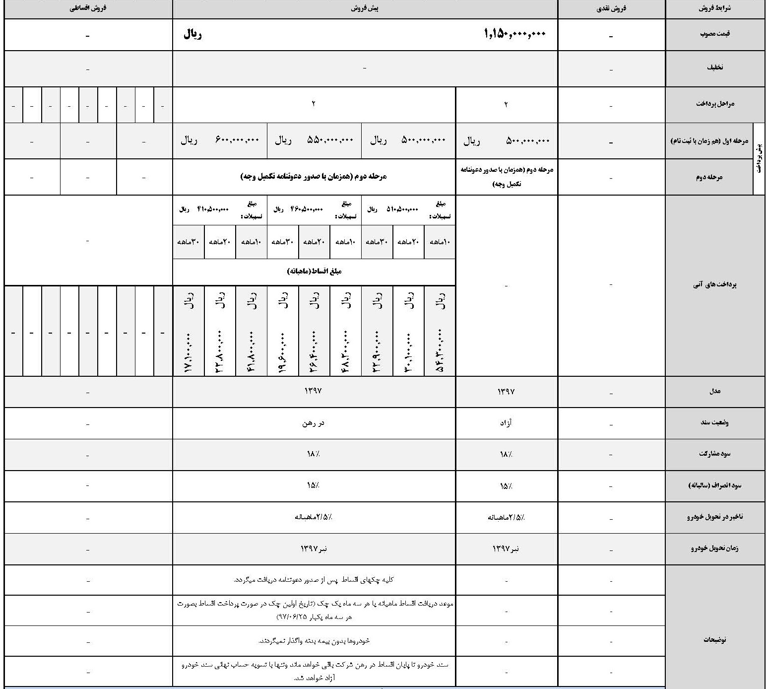 کلیه هزینه ها، مالیات ها، عوارض، بیمه شخص ثالث، بیمه ارزش افزوده و سایر هزینه هایی که قانون پرداخت آن را به عهده مشتری و مصرف کننده گذاشته است بر اساس تعرفه های سال 1397 محاسبه شده است. بدیهی است در صورت تغییر قوانین و نرخ ها در زمان تحویل خودرو مابه التفاوت به عهده متقاضی می باشد.