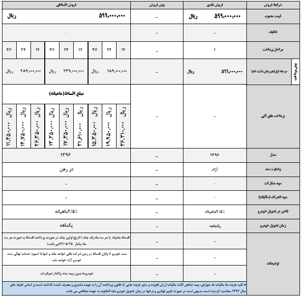 کلیه هزینه ها، مالیات ها، عوارض، بیمه شخص ثالث، بیمه ارزش افزوده و سایر هزینه هایی که قانون پرداخت آن را به عهده مشتری و مصرف کننده گذاشته است بر اساس تعرفه های سال 1397 محاسبه شده است. بدیهی است در صورت تغییر قوانین و نرخ ها در زمان تحویل خودرو مابه التفاوت به عهده متقاضی می باشد.