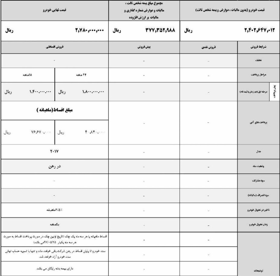 کلیه هزینه ها، مالیات ها، عوارض، بیمه شخص ثالث، بیمه ارزش افزوده و سایر هزینه هایی که قانون پرداخت آن را به عهده مشتری و مصرف کننده گذاشته است بر اساس تعرفه های سال 1397 محاسبه شده است. بدیهی است در صورت تغییر قوانین و نرخ ها در زمان تحویل خودرو مابه التفاوت به عهده متقاضی می باشد.