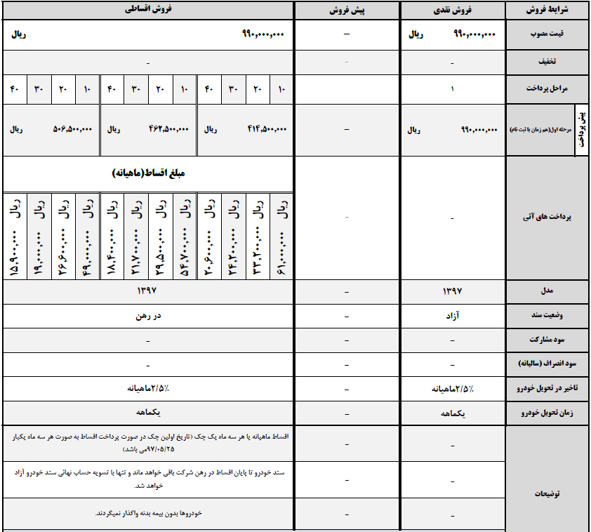 کلیه هزینه ها، مالیات ها، عوارض، بیمه شخص ثالث، بیمه ارزش افزوده و سایر هزینه هایی که قانون پرداخت آن را به عهده مشتری و مصرف کننده گذاشته است بر اساس تعرفه های سال 1397 محاسبه شده است. بدیهی است در صورت تغییر قوانین و نرخ ها در زمان تحویل خودرو مابه التفاوت به عهده متقاضی می باشد.
