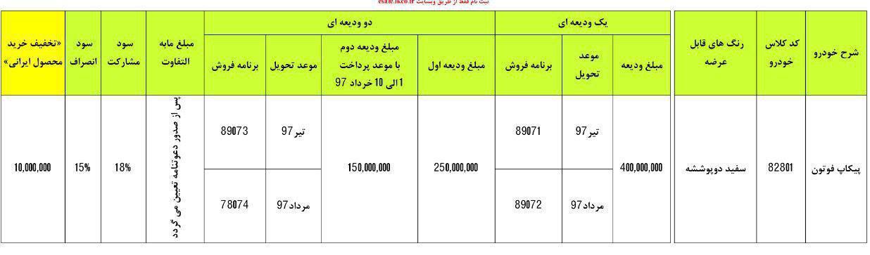 شرکت ايران خودرو با ھمکاري شركت ايران خودرو ديزل، شرايط پیش فروش خودروي "پیكاپ فوتون TUNLAND "را با "ظرفیت محدود " از روز دوشنبه 97/02/17 لغایت 97/02/31 و يا تا زمان تکمیل ظرفیت ، به شرح جدول پیوست ارائه مي نمايد: