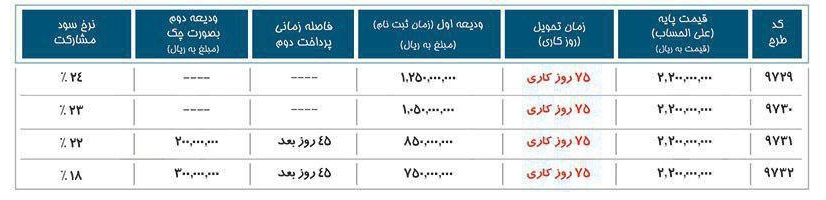 شرایط طرح های فروش نیوکوراندو ( نقدی ) به شرح جدول ذیل می باشد.