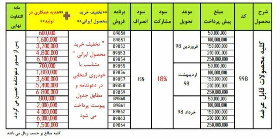 تخفیف خرید محصول ایرانی صرفأ در صورت واریز نقدی مابه التفاوت نهایی در مهلت تعیین شده در دعتونامه و دریافت خودرو پرداخت می گردد و در صورت منقضی شدن دعوتنامه و یا انصراف قرارداد قابل ارائه نمی باشد.