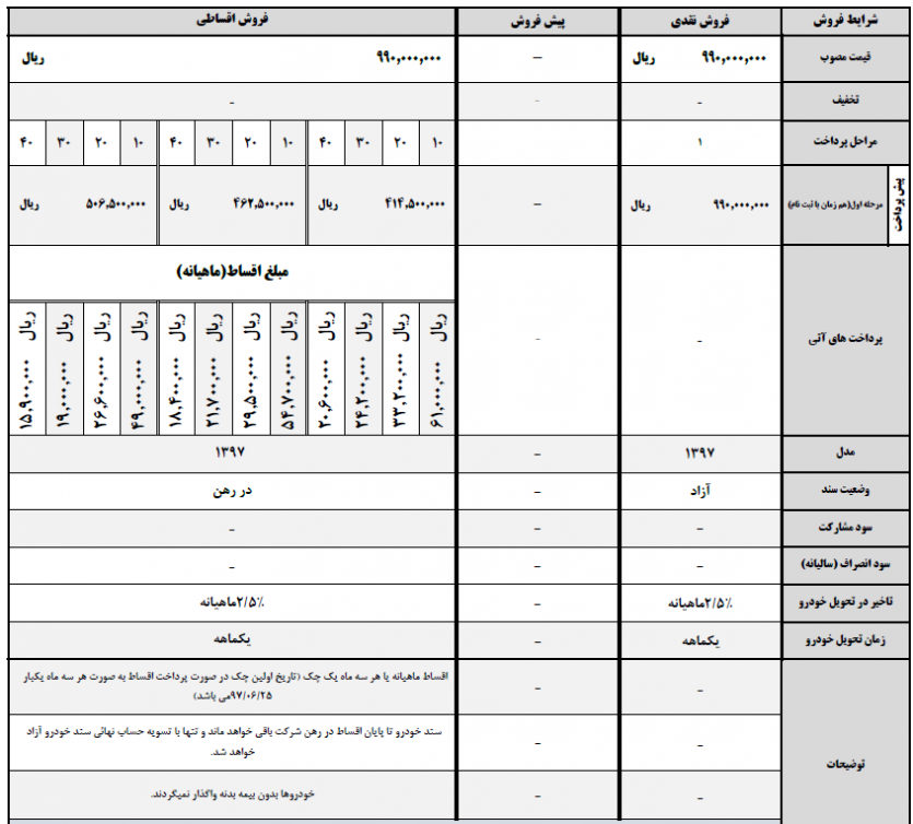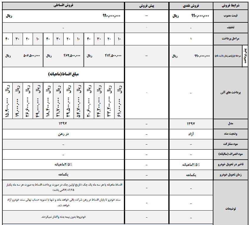 کلیه هزینه ها، مالیات ها، عوارض، بیمه شخص ثالث، بیمه ارزش افزوده و سایر هزینه هایی که قانون پرداخت آن را به عهده مشتری و مصرف کننده گذاشته است بر اساس تعرفه های سال 1397 محاسبه شده است. بدیهی است در صورت تغییر قوانین و نرخ ها در زمان تحویل خودرو مابه التفاوت به عهده متقاضی می باشد.