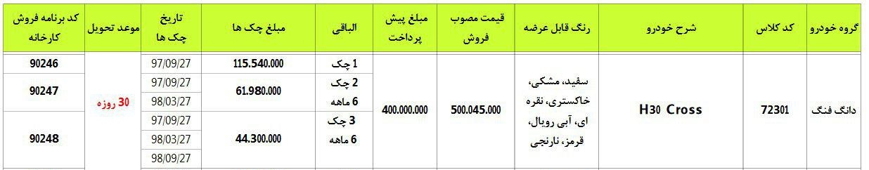 به اطلاع کلیه متقاضیان محترم میرساند شرایط فروش اقساطی خودروی اچ سی کراس / H30 Cross تا تکمیل ظرفیت به شرح جدول زیر است.
