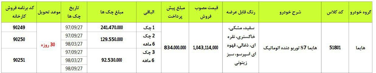 فروش قطعی دو مرحله ای (مشارکت در تولید) خودروی هایما S7 توربو از روز یکشنبه مورخ 97/03/27 تا زمان تکمیل ظرفیت، به شرح جدول زیر اعلام می گردد: