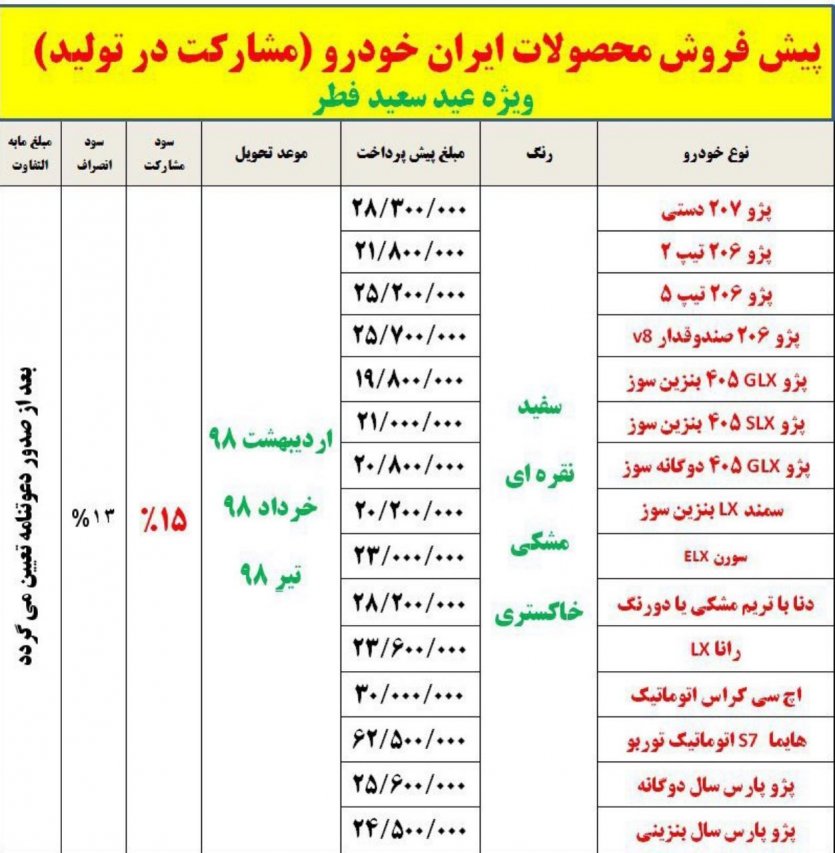 شرایط فروش ایران خودرو به مناسبت عید فطر (دور اول):