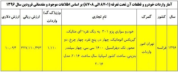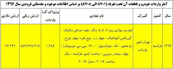 برای بررسی قیمت و مدل این خودرو به سایت گمرک ایران مراجعه کردیم . در سایت گمرک در حال حاضر فقط اطلاعات آماری مربوط به ماه فروردین امسال ارایه شده است . با بررسی دقیق این جداول به اطلاعات خیلی قابل توجهی در مورد پژو 508 و همچنین خودروهای وارداتی دیگری که از طریق ایران خودرو وارد می شوند برخورد کردیم که شامل رنو کپچر و پژو 301 می باشد که به بررسی هریک از آنها خواهیم پرداخت .