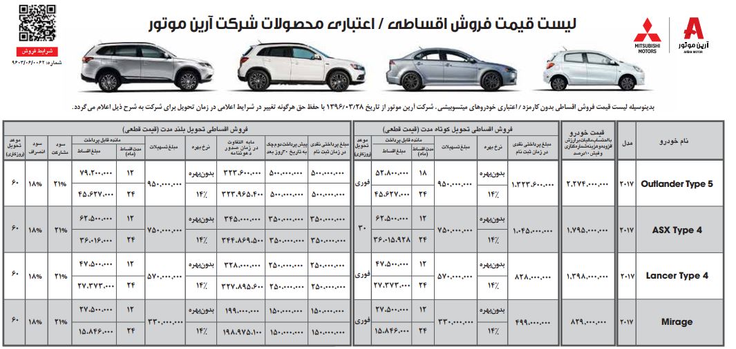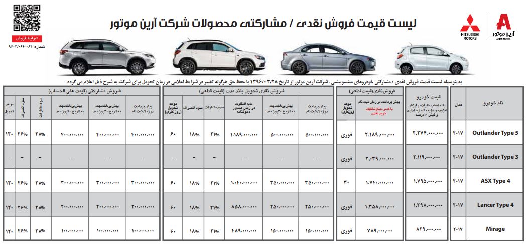 شرکت آرین موتور لیست قیمت نقدی و اقساطی برند میتسوبیشی ویژه مردادماه را ارائه داد.