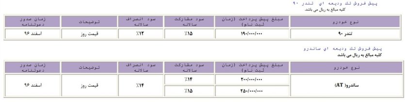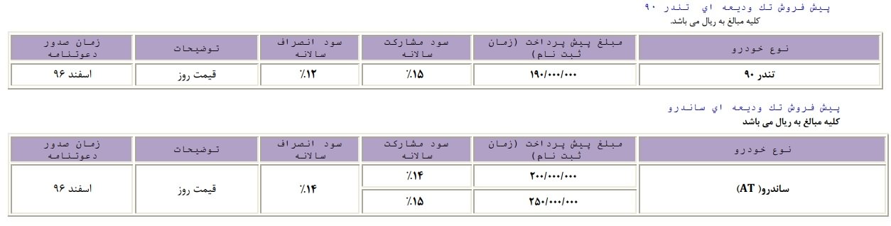 شرایط جدید فروش اینترنتی خودروهای تندر90 و ساندرو اتوماتیک از ساعت 16 روز چهارشنبه مورخ 96/05/011 تا زمان تکمیل ظرفیت به شرح جدول ذیل اجراء میگردد.
