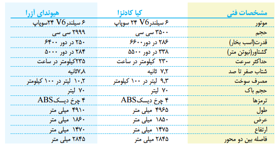 دقت داشته باشید که باوجود کوتاه شدن طول کادنزا نسبت به اپیروس، فاصله بین دومحور آن افزایش طول داشته است که با برخورداری از تعلیق جمع وجورتر در عقب مي توانيد شاهد فضایی حجیم تر و دلبازتر در داخل نسبت به مدل قبل باشيد. فاصله ای که تقریبا يكسان با فاصله بین دومحور آزرای جدید است. در مقابل هم نسل جدید آزرایی را می بینید که با معرفی در سال 2012، حداقل 3 سال جوانتر از کادنزا است.