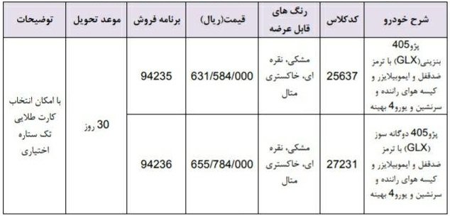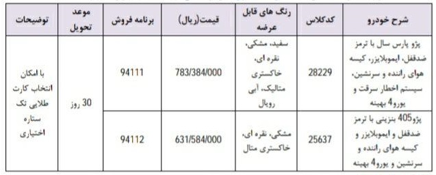 توجه: فروش جدول زیر در تاریخ 26 فروردین 98 اصلاحیه خورد و به جای 206 تیپ 5 206 تیپ 2 با قیمت 672.834 ریال و موعد تحویل 30 روزه جایگزین شد.(بروزرسانی 26 فروردین 98)