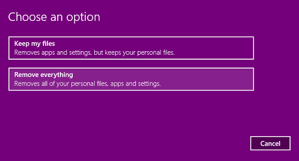 برای ریست سریع Just remove my files را انتخاب کنید یا برای گزینه امنتر ولی کندتر از Remove files and clean the drive استفاده کنید.