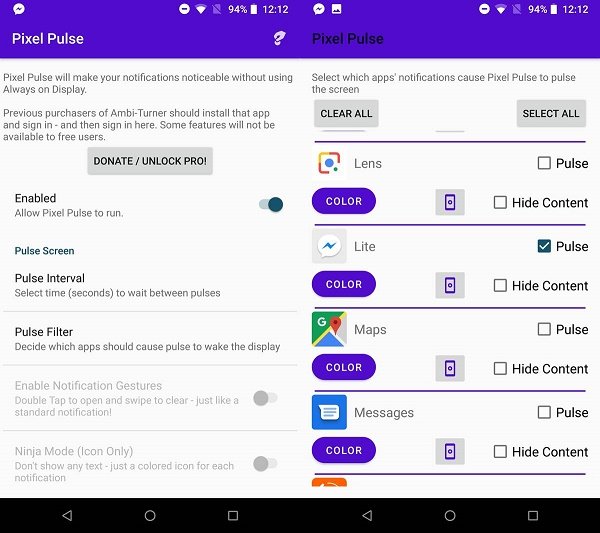 اپ Pixel Pulse را دانلود، نصب و در نهایت برنامه را اجرا کنید. این اپ نیاز بهدسترسی به نوتیفیکیشنها را دارد و شما باید مشخص کنید که کدام اپها میتوانند نوتیفیکیشنهای پالس را نمایش دهند. قویا توصیه میکنیم که این لیست را کوتاه نگه دارید و علاوه بر آن تعداد دفعاتی که صفحه برای یادآوری کردن نوتیفیکیشنها روشن میشود را مدیریت کنید.