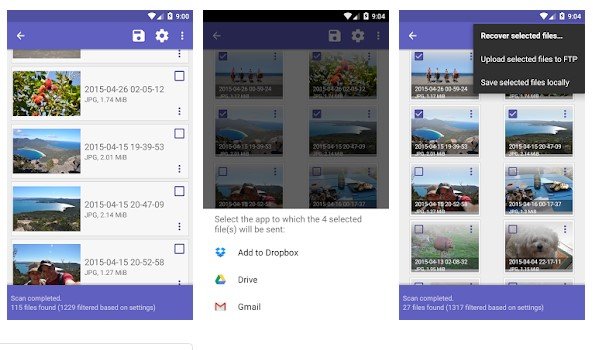 این نرمافزار بازیابی اطلاعات برای این کار نیازی به کامپیوتر ندارد. شما میتوانید DiskDigger را از گوگل پلی دانلود کنید و با استفاده از آن فیلمها و عکسها را بازیابی کنید. در ضمن، با نسخه پیشرفته آن میتوانید فایلهایی با پسوندهای دیگر را هم دانلود کنید. اما در حال حاضر نسخه رایگان آن فقط قادر بهبازیابی فایلهای تصویری و ویدیویی است. نرمافزار بازیابی اطلاعات DiskDigger بهبهترین شکل فضای ذخیره گوشی را اسکن میکند و تمام فایلهای قابل بازیابی شدن را لیست میکند. بههمین دلیل است که از DiskDigger بهعنوان یکی از بهترین اپهای بازیابی اطلاعات روی دستگاههای اندروید نام برده میشود.