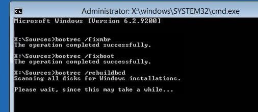 در پنجره خط فرمان فرمان bootrec /fixmbr را وارد کرده و کلید اینتر را فشار دهید. سپس فرامین /fixboot و bootrec /rebuildbcd را به ترتیب وارد کنید.