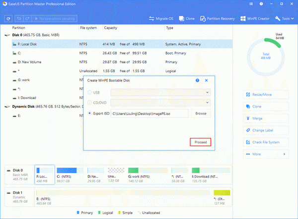 مرحله 1. ابتدا EaseUS Partition Master را دانلود و روی کامپیوتر خود نصب کنید. سپس این اپلیکیشن را باز کرده و در نوار ابزار آن روی WinPE creator کلیک کنید. حالا یک دیسک یا درایو USB قابل بوت را با کلیک روی دکمه Proceed بسازید.