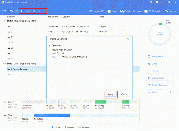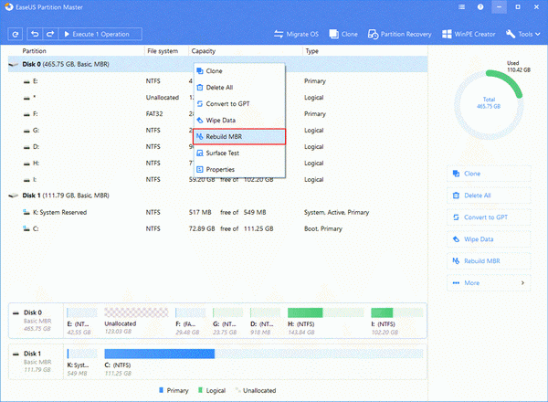 ابزار EaseUS Partition Master در خود قابلیتی به نام Rebuild MBR دارد که با بازنويسی مجدد Master Boot Record دیسک انتخاب شده بدون صدمه زدن به پارتیشنهای دیسک مشکل را برطرف میکند.